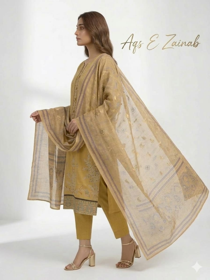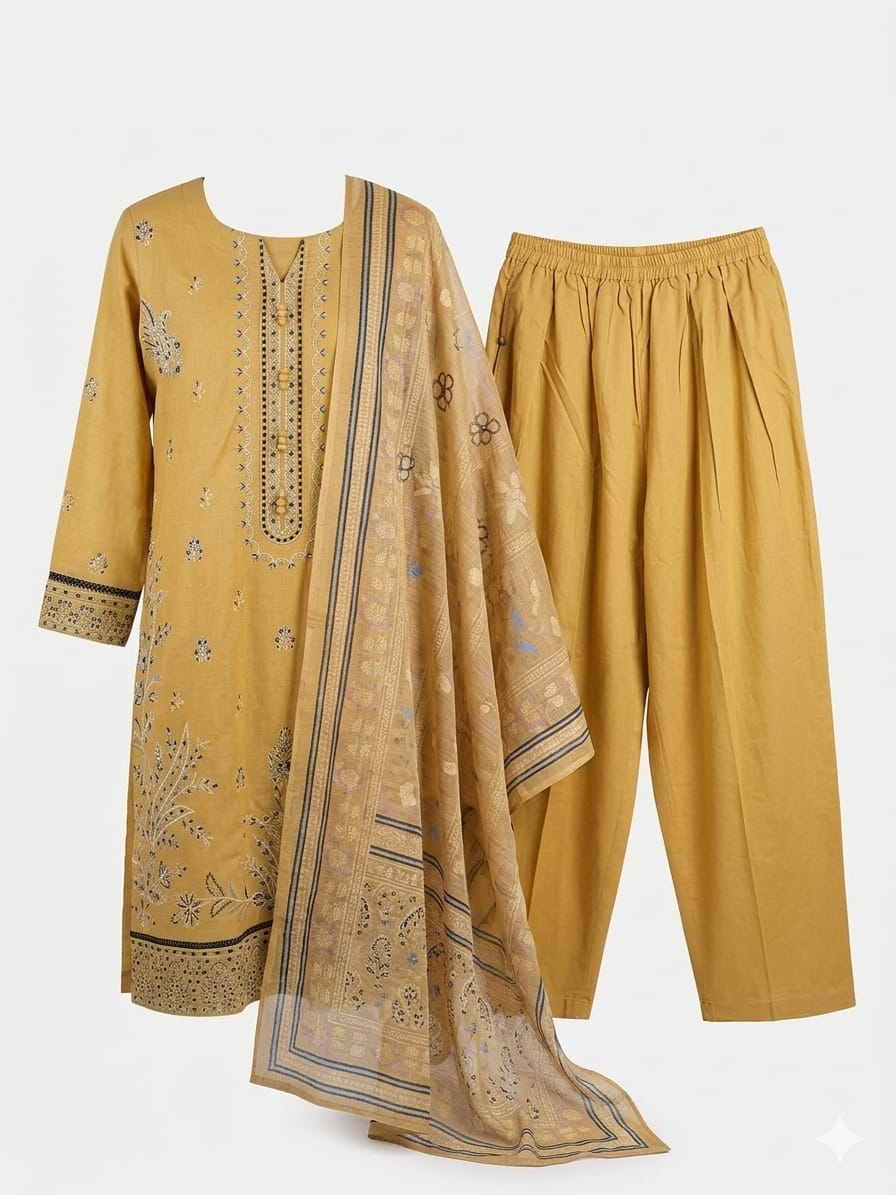 This 3-piece ladies suit is designed to give a stylish, elegant, and attractive look while keeping comfort in mind. The set includes a beautiful kurta and matching bottom, creating a neat and graceful outfit that is easy to wear and style.